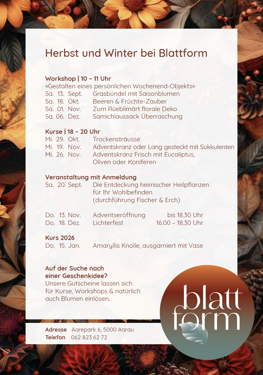 Freuen Sie sich auf kreative Stunden in gemütlicher Atmosphäre! Ob frische Blumen, herbstliche Dekorationen oder winterliche Kränze - bei uns nehmen Sie Ihre schönsten Erinnerungen gleich mit nach Hause.
